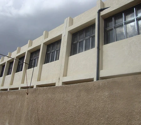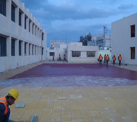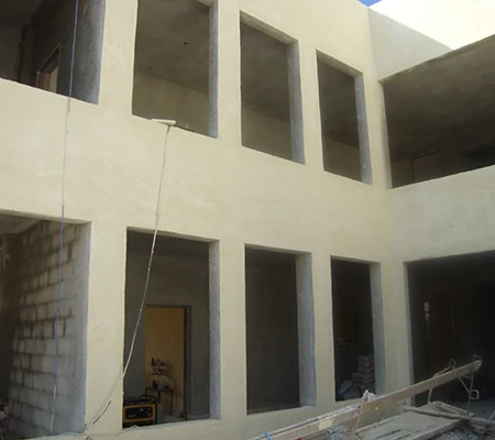 أما بالنسبة للتشطيبات الخارجية، فقد تم استخدام الجص الخشن والطلاء بالرش التيرولي على الجدران الخارجية، بينما تم رصف ساحات المدرسة بالكامل باستخدام بلاط عالي الجودة وتجهيزها لاستخدام الطلاب.