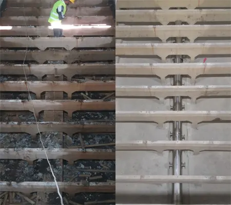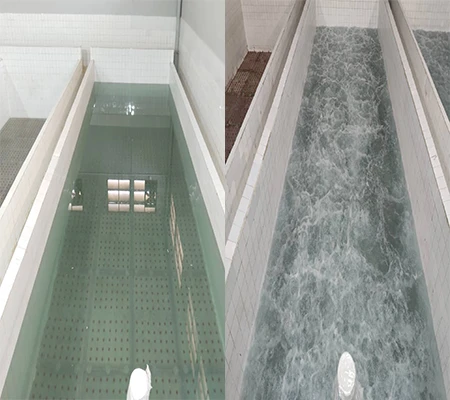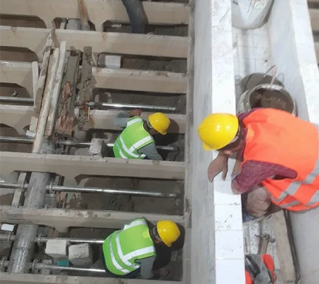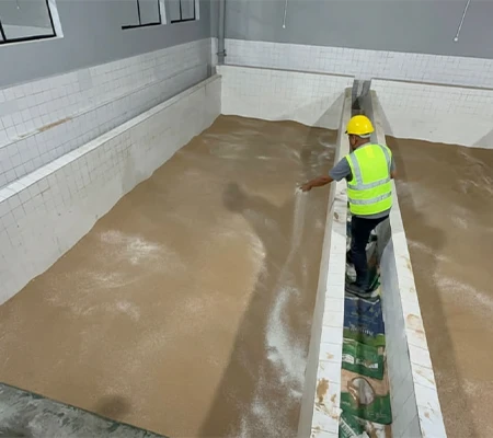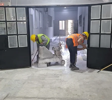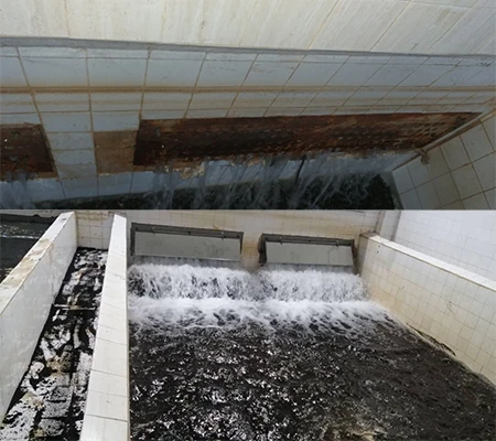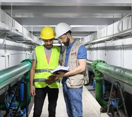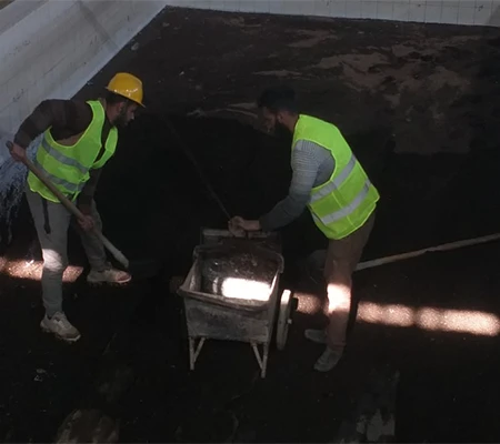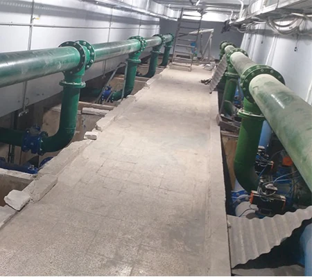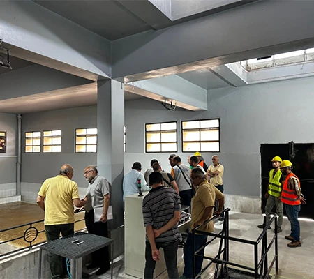 The basins in the left section of the drinking water treatment plant were rehabilitated. The work included removing old resides, replacing the bases of sand filters and filtration ele-ments, as well as the raw water circuits, treated water circuits, electrical control systems, and air circuits, Architectural restoration was also carried out, along with the integration of GRP panel technology. These works were implemented under the supervision of a non-governmental organization (NGO)